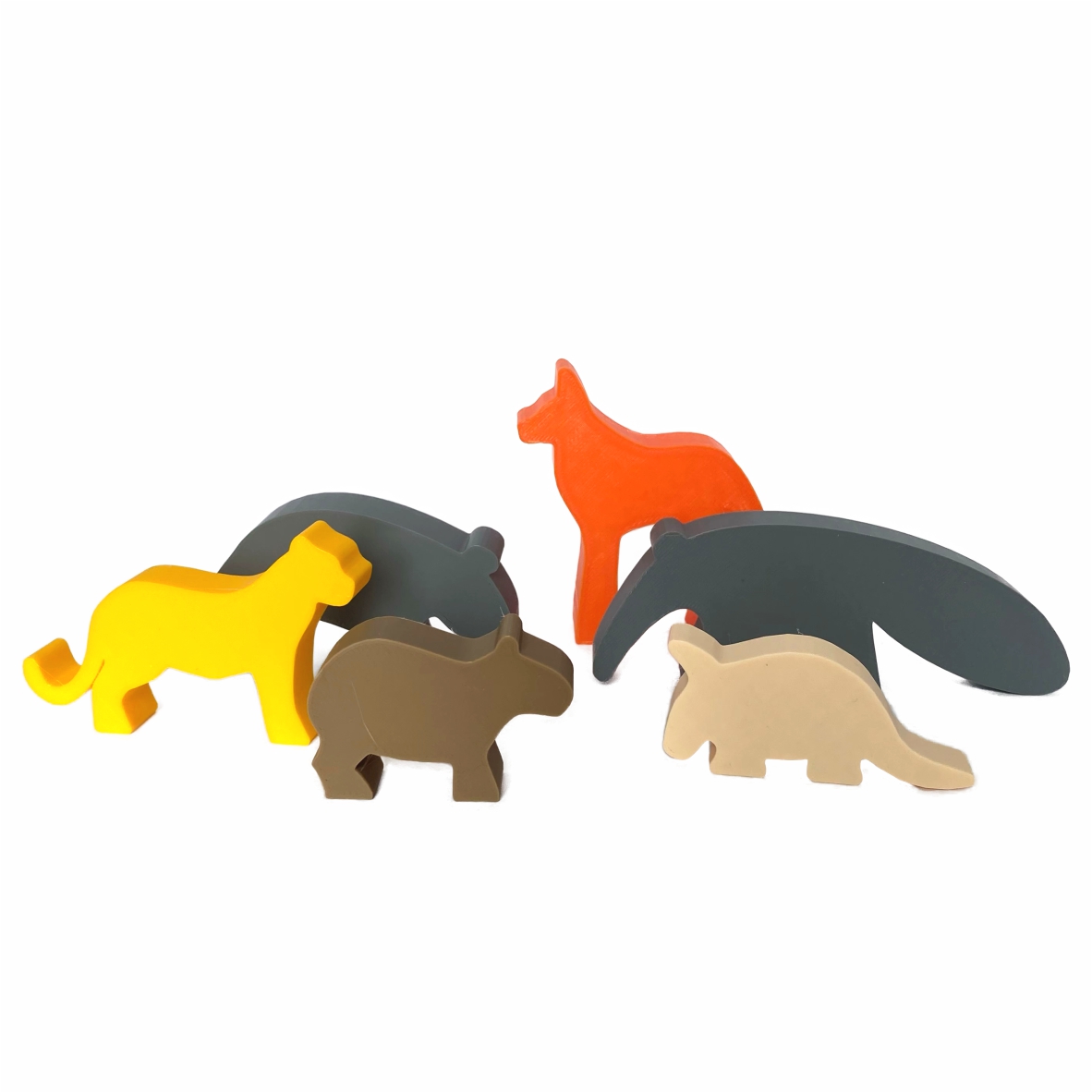 Animais Brasileiros: 1 onça, 1 lobo guará, 1 anta, 1 tamanduá, 1 capivara e 1 tatu.