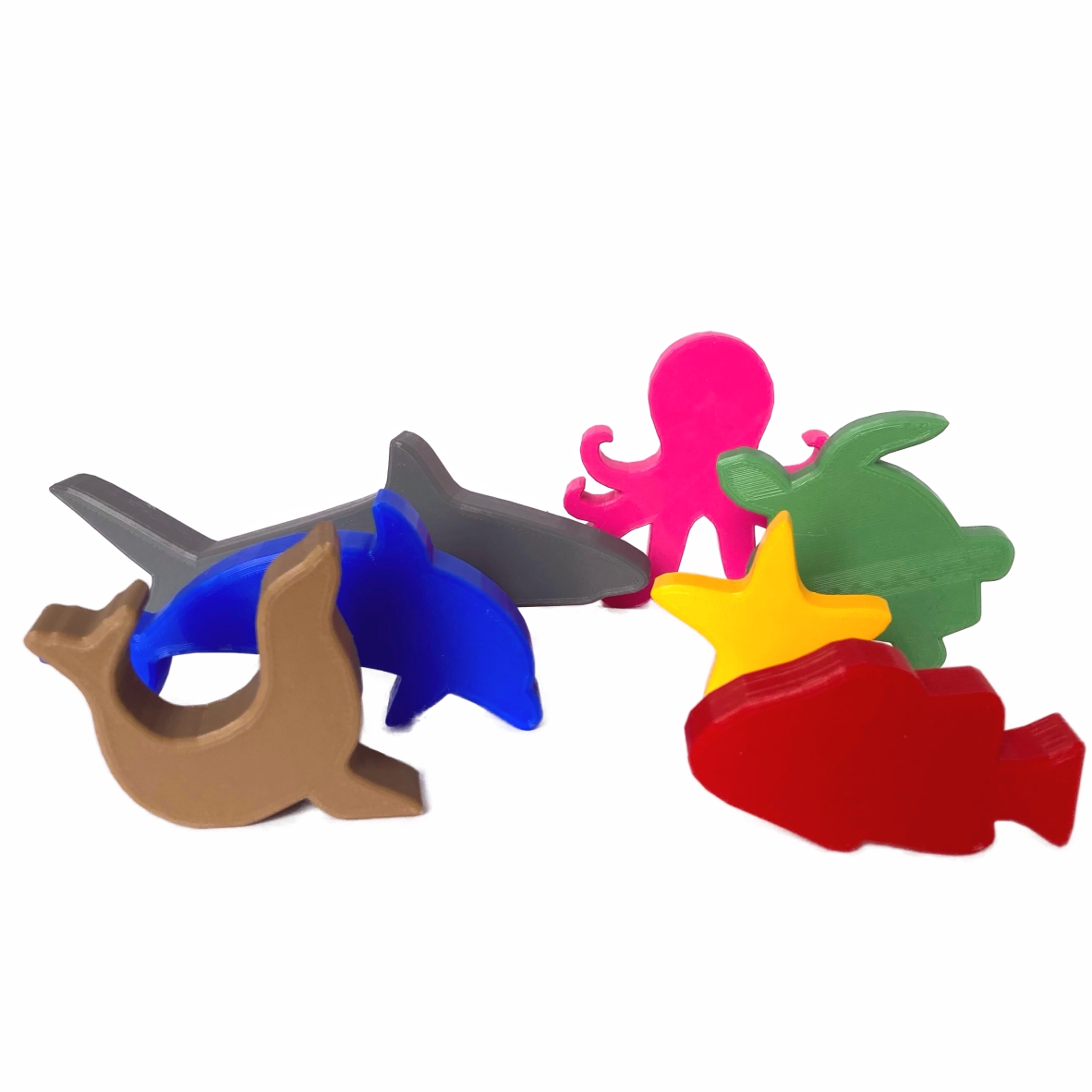Animais Marinhos: 1 tubarão, 1 golfinho, 1 peixe, 1 tartaruga marinha, 1 estrela do mar, 1 polvo e 1 foca.